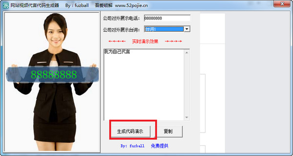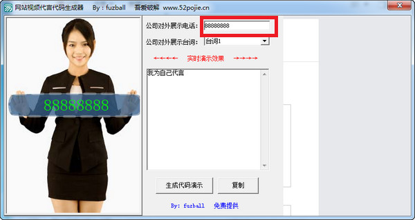网站视频代言代码生成器是一款能够自动生成一个网页上女代言人为你网站代言的视频文件代码,视频可展示电话及语音播放指定台词。