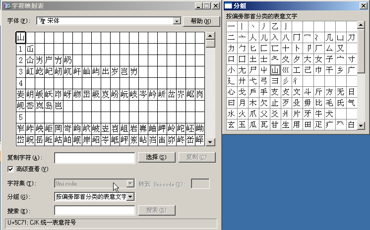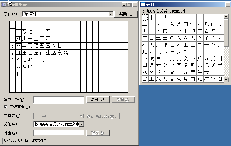 然后在分组中选择按偏旁部首分类的表意文字。