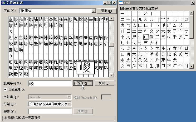 比如我们要找嵕这个字,我们不会读,没法把它打出来,但是我们看到他的部首是山。我们就在右边找山,选中。