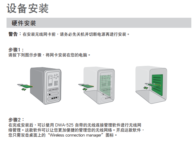 dlink dwa 525是台式计算机无线网卡,dlink dwa 525网卡怎么安装呢?下面给大家带来的是dlink dwa 525使用说明书(安装指南),有需要的朋友可以免费下载dlink dwa525说明书。