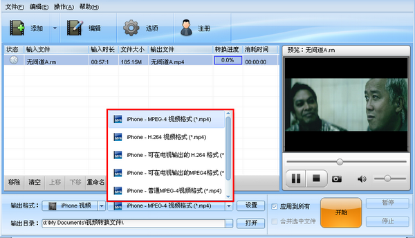 选择了相应的产品视频,就可以在第二个选项里选择具体要转换的视频格式啦。比如iPhone移动产品就包含了MPEG-4、H-264、可电视输出的MPEG-4、可电视输出的H-264等一系列不同的视频格式,不同的格式可满足用户不同的需求。