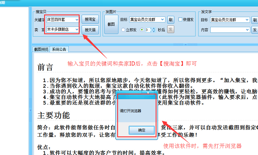 集宝自动软件能帮您做任务时自动完成浏览宝贝、货比三家,并可以自动发送截图到指定QQ(或YY),极大的减轻您的工作量,释放您的双手,让您有时间喝杯咖啡,享受工作的乐趣!