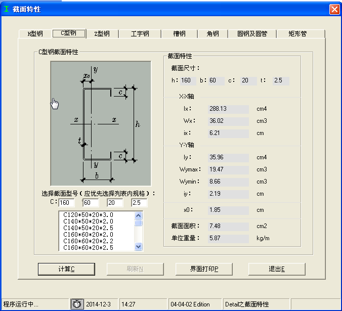 包括H型钢,C型钢,Z型钢,工字钢,槽钢,角钢,圆钢及圆管,矩形管截面特性查询及计算
