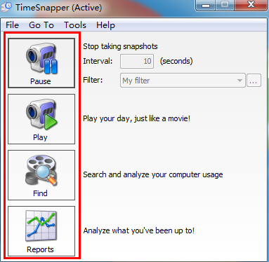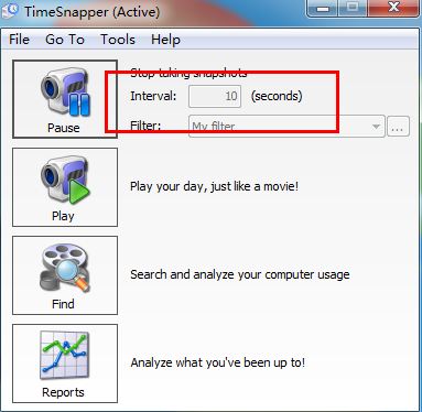 功能非常简单,就是指定间隔时间来抓取屏幕截图并保存到固定的目录下。然后你还可以像看电影一样来回顾先前的图片记录。启动的时候,如果指定了参数 /a 就可以自动最小化来开始工作。为了不太影响工作,把默认的截图的间隔时间从5秒修改到30秒或更多。