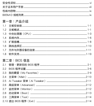 华硕B85M-D主板拥有5重防护,全方位保护主板,USB 3.0加速 (支持USAP协议) ,数据下载传输更快,智能管家3代,实时掌控电脑使用情况。以下文档是华硕B85M-D用户手册,有需要的朋友可立即下载此文档。
