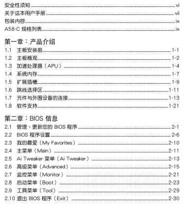 华硕A58-C主板采用防潮不锈钢I/O 接口,保护接口不受腐蚀侵害,全新EZ Mode便捷模式,快速配置风扇参数,按下Q-Slot卡扣,显卡即可弹出。以下文档是华硕A58-C用户手册,有需要的朋友可立即下载此文档。