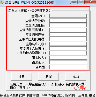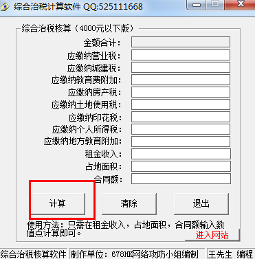 综合治税计算软件是统计治税计算的一种软件,方便用户计算。不用再浪费时间了。操作简单,只需输入土地的租金输入和占地面积还有合同额那里输入,点击计算,结果就会出来,非常方面的一款治税计算软件。