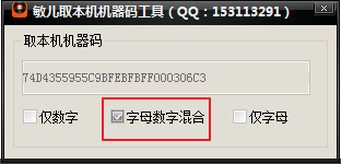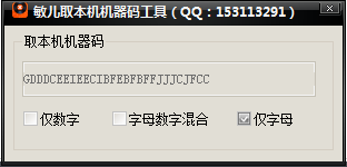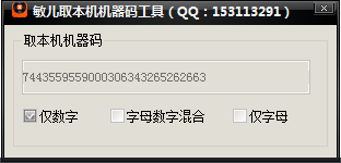 敏儿取本机机器码工具是一款可以方便查看本机机器码的小工具。方便又机器码需求的人,本工具不光可以排列出全数字的机器码,而且还有全字母、字母数字混合的机器码,适应多方需求。