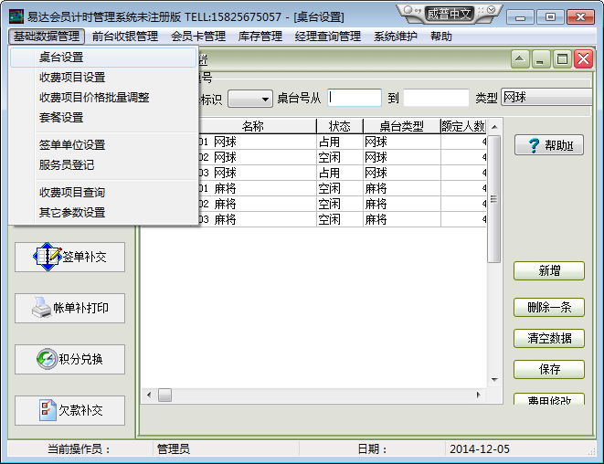 主要包括:桌台设置,收费项目设置,消费品套桌设置,签单单位设置,服务员登记,收费项目查询,其它参数设置。