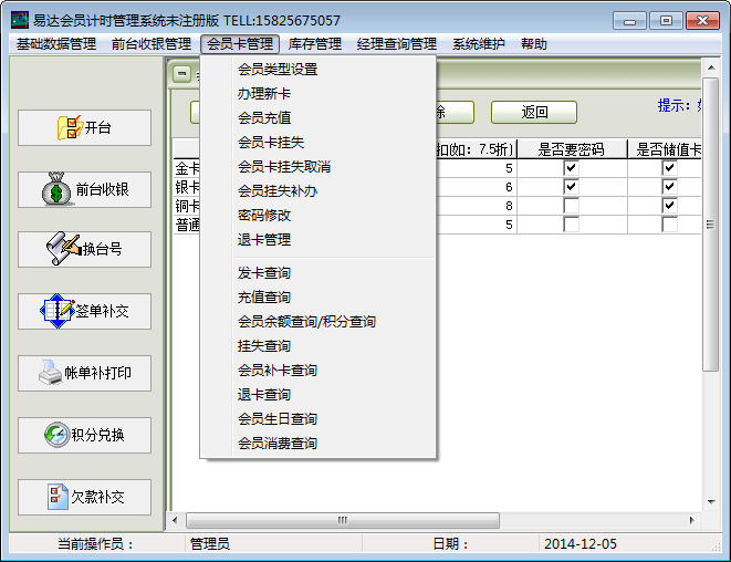 会员卡支持磁卡,条形卡,ID卡,IC卡,包括如下功能:会员类型设置,办理新卡,会员充值,会员卡挂失,挂失取消,挂失补办,卡密码修改,退卡管理,发卡查询,充值查询,会员余额查询,挂失查询,补卡查询,退卡查询,会员生日查询,会员消费查询。