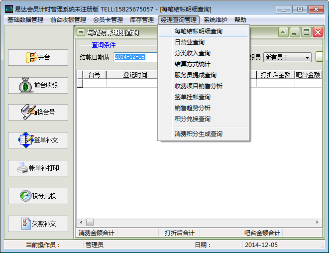 每笔结帐明细查询,日营业查询,分类收入查询,结算方式统计,服务员提成查询,收费项目销售分析,商品退单赠单查询,签单挂帐查询,销售趋势分析,积分兑换查询,消费积分生成查询。