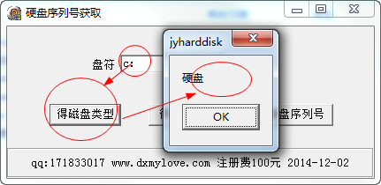 3、选择盘符,点击下面的【得硬盘序列号】后就可以知道自己的盘序列号了!