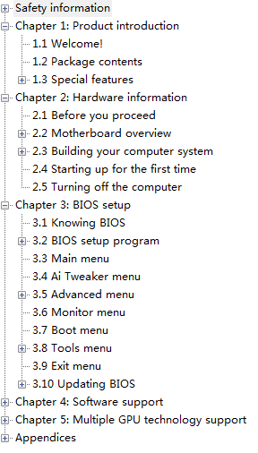 华硕P8Z77-V DELUXE主板采用两个内建芯片 - EPU智能节能处理器及TPU智能加速处理器。SMART DIGI+ 技术也包括智能处理器供电调校设定文件,按一下鼠标即可将 CPU 耗电量降低至特定瓦数,打造出一个安静、凉爽的PC使用环境。以下文档是华硕P8Z77-V DELUXE用户手册,为英文版,有需要的朋友可立即下载此文档。
