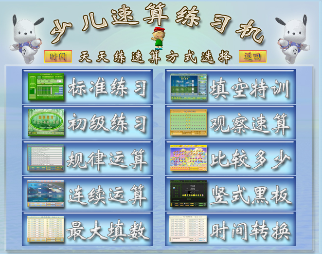 经过长期的测试,对提高少儿四则运算和心算速度与准确率有非常明显的效果,包含了“天天练速算”由“标准练习”、“填空特训”、“初级练习”、“观察速算”、“规律运算”、“比较多少”、“连续运算”、“竖式黑板”、“最大填数”、“时间转换”、“认识时间”11个部分组成)、“模拟考场”、“卷王系统”(可产生68种以上完全不同的试卷)、“附加部分”(人机桌面大战、难题百宝箱、数字加法贪吃蛇等不断可扩充内容组成)、“分支题型练习”(二分支类型、三分支类型、四则混合、混合增强、三角连续运算以及随未来版本升级而不断扩展的练习类型)等五大模块。