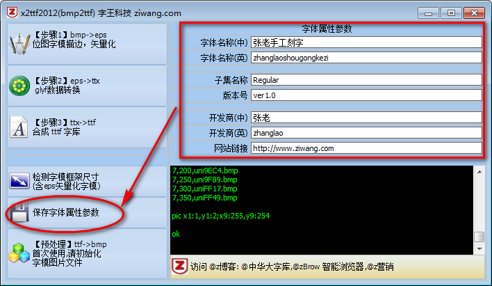 第5步: 打开x2ttf软件,填写字体参数,点左边的“保存字体属性参数”,如图。