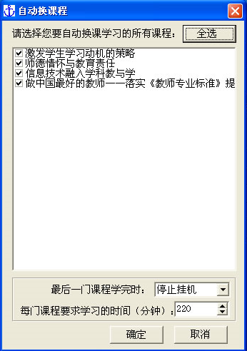第二步:再点击软件上方的“自动换课”按钮,弹出对话框后选择要自动换课学习的课程(可全选,已达到学习时间要求的软件会自动跳过),设定好每门课要学习的时间之后按确定。若此课程学习时间已超过规定学习时间则软件会自动更换课程再自动学习如图:
