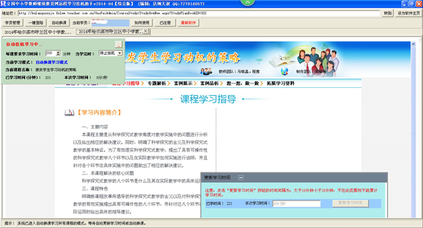 参加过全国中小学教师继续教育网远程培训学习的教师都知道,在学习完十至二十分钟之后必须点击“更新学习时间”按钮才会计时,之后才可以继续学习,有的还要输入验证码才能更新学习时间。若使用本挂机软件在继教网远程学习则软件会自动更新学习时间,这样教师可认真学习而不用担心学习时间问题了。