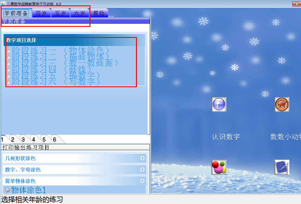 2、软件界面右区为综合智力开发练习,系统的打印练习可以阶梯式的提高儿童动手动脑能力,智力开发练习可以借助多媒体的优势更加形象的、全面的表现知识,结合两者可以有效开发儿童智力。如果能坚持按照软件的阶段进行练习,完全可以取代幼儿园数学培训班,不仅可以节省大量开支,还能取得您意想不到的成效。
