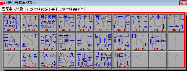 培尔五笔字根表具有QQ的自动窗口收缩功能,方便学习五笔字型及使用五笔字型打字的人员进行字根查询,本软件包含五笔86、98两种字根表。可实现程序自启动功能。