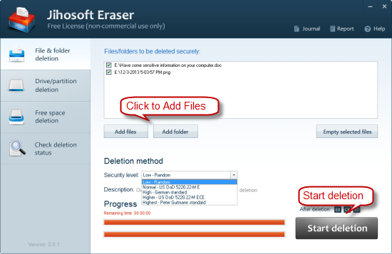 单击“添加文件”或“添加文件夹”按钮导入目标对象为橡皮擦。然后从“安全级别”下拉列表中,选择一个作为你想要删除的方法。最后单击“启动删除“清除数据。