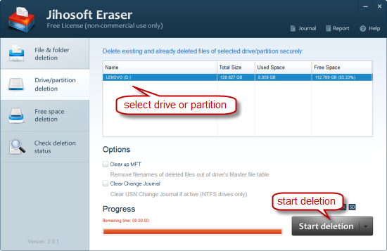 使以前删除的文件在一个特定的驱动是不可恢复的了,你可以选择此数据擦除模式。选择驱动器,您要抹掉可用空间,请单击“启动删除“拿起破坏数据的方法,然后自由空间被使用随机数据覆盖。