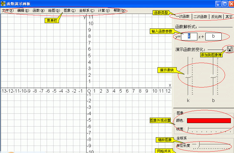 2、动态地演示一次函数、二次函数、反比例函数、指数函数、对数函数、三角函数、圆锥曲线等十几种软件定制的函数图象的变化。使用本功能,你可以方便地讲解、体会和研究在各种函数中,各系数对函数图象的影响,以及它们在函数性质——特别是在图象性质方面的作用。