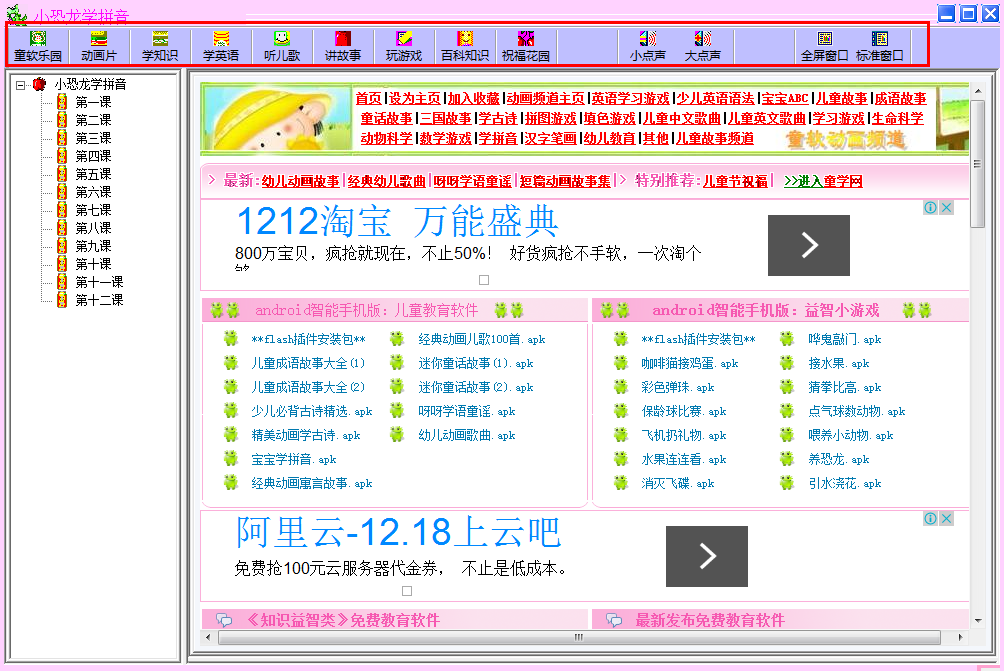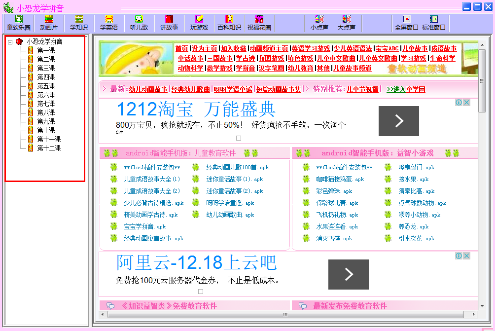小恐龙学拼音是一款功能非常全面的标准拼音学习软件,这款软件之中将拼音学习分为12节课,难度逐步加深,能够非常有效的帮助孩子学习到非常标准的拼音,为孩子的将来打下基础。软件之中除了学习拼音功能之外,还具有动画片、学知识、学英语、听儿歌、讲故事等诸多功能。