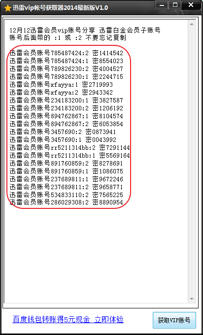 迅雷VIP账号获取器2014最新版是一款绿色免费的最新2014迅雷VIP账号获取器。该软件日更新近百个迅雷会员账号,全都稳定可用,欢迎有需要的用户下载使用!