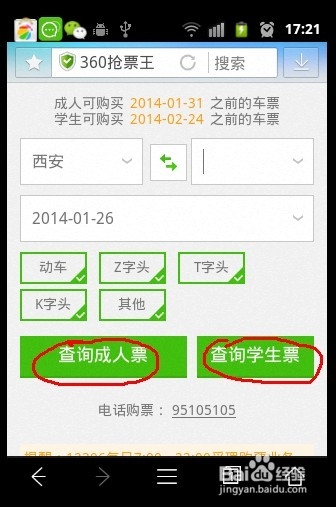 第四步:我们就可以输入所需的信息,然后进行查询。在这里有两种查询:一种是成人查票;另一种是学生查票。如下图所示: