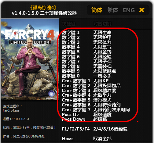 孤岛惊魂4二十项属性修改器说起来就是相当多的朋友都在玩耍的同名游戏辅助修改工具,他的出现能够帮助大家拥有无限护甲、无限氧气等等多达二十项的强悍功能,使得大家不需要在害怕游戏里面的