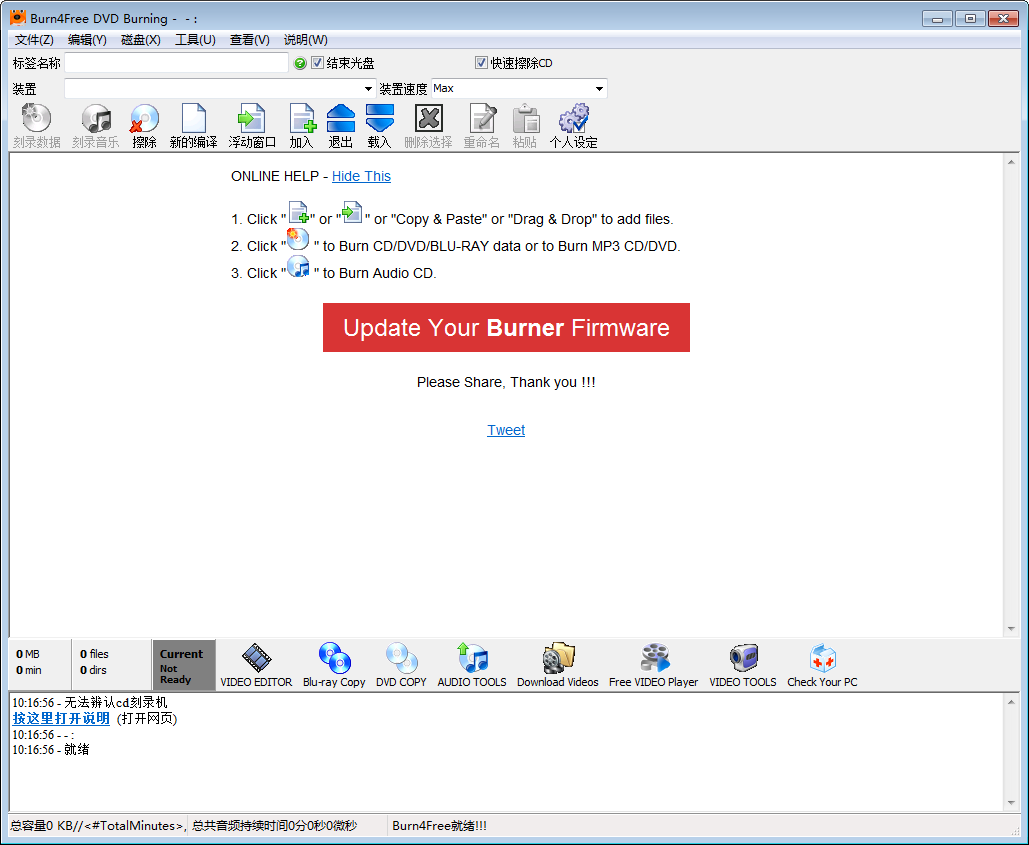 Burn4Free是一款光碟工具,按两下鼠标即可完成 CD/DVD 烧录动作,支持 CD-R/CD-RW/DVD-R/DVD+R/DVD-RW/DVD+RW/DVD-RAM drives (SCSI - IDE/EIDE - USB),特别的是:可以激活「拖曳目标」,将档案以拖曳的方式加入烧录清单!