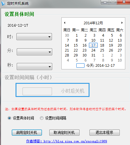 尘缘定时关机软件可以指定一个时间,也可以指定时间间隔进行关机操作。使用本软件,请确保您的系统上带有.NETFRAMEWORK2.0或更高版本!可以定时关机,省去您的关机烦恼。