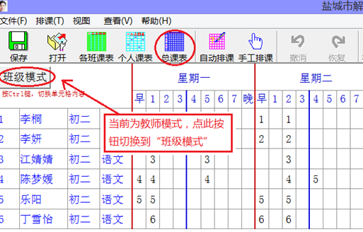 6.在“总课表”视图中增加了模式切换按钮,可以显示全校每个班的课表,也可以显示全校所有教师的课表,同时,在教师模式下支持手动调整和人工排课,大大地方便地喜欢人工排课的学校。