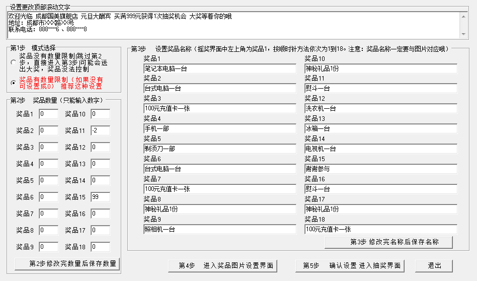 第三步,填入奖品的名称,注意这里的名称和第二步的奖品是一一对应的。1-18个中的多个奖品可以用相同的名称和图片。比如:奖品2、6、9的名称都是神秘礼物(根据自己的情况合理处理)。