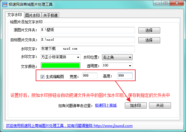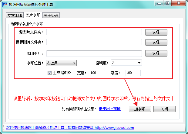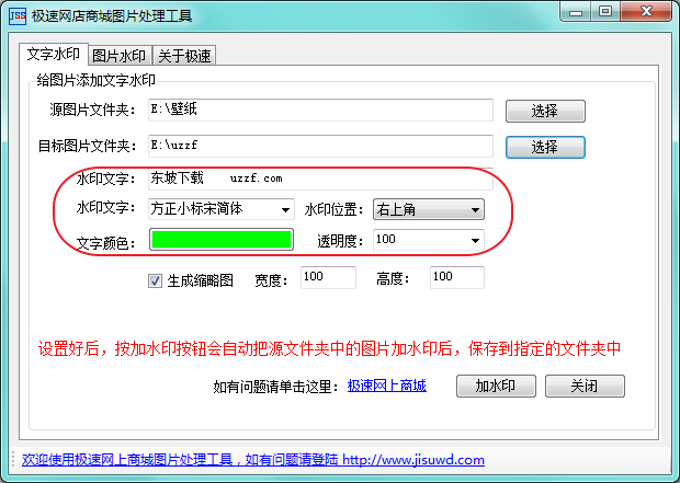 极速网店商城图片处理工具是一款绿色小巧的图片批量添加水印软件。该工具操作简单,一键批量添加,可自定义水印文字内容和图片,欢迎有需要的用户下载使用!
