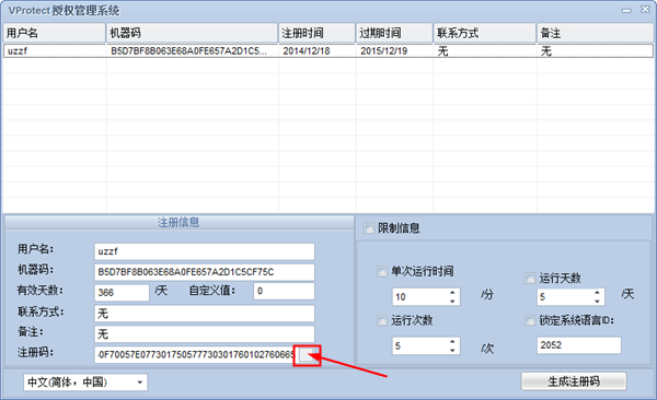 3、填写你的用户名和有效天数,点击【生成注册码】按钮生成
