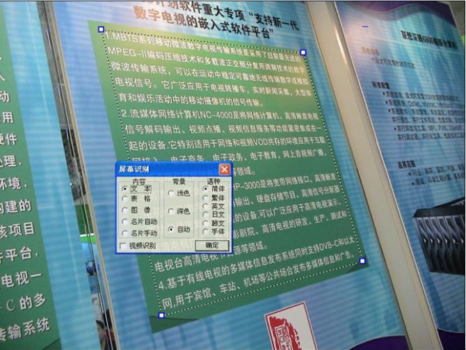 四个角上的小方框的位置是可以随意调整的!上面的这个是屏幕识别,选择合适的参数后点击确定即可!几秒钟后出来如下的识别结果: