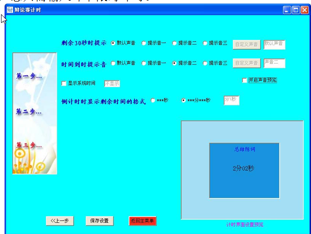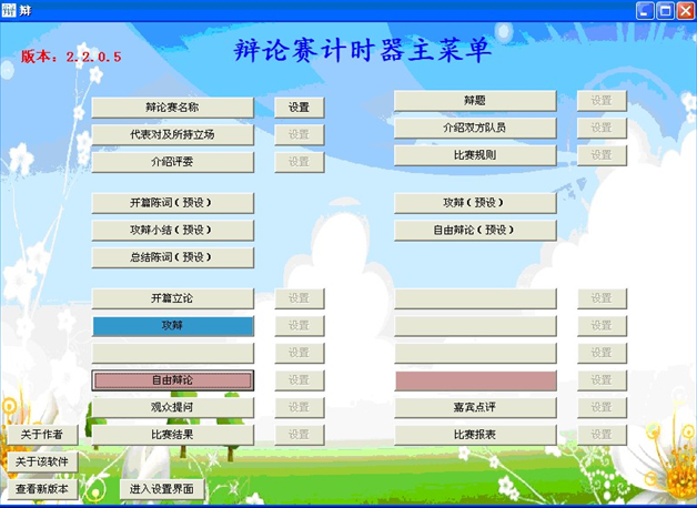 对于辩论赛来说,有时出来比赛队员与裁判外,最不能缺的就是无忧辩论赛计时器软件,通过它才能有一个最公正的时间。他不但界面非常美观,而且时间设定也非常人性化,更重要就是适合很多比赛场合使用!