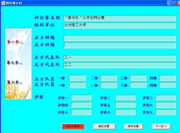 3、在此界面中,您可以设置辩论赛名称、组织单位、辩题、代表队名称、双方队员、评委信息。