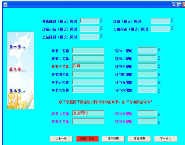 4、在此界面中,您可以设置各个环节的名称、限时。字体为红色的环节,您只需输入环节限时即可。