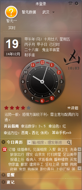 99每日运势万年历是一款功能强大的可查询运势的万年历软件。该软件采用八字和紫微斗数为核心来计算个人流年运势,每月运势,每日运势,另外结合黄历每日宜忌,天气预报、好友生日提醒等诸多功能的桌面日历类软件。
