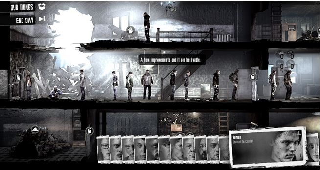 设定在一个战火连连的现代世界,游戏的视角从机甲战士转移到了寻找,你的目标就是去解救平民。《This War of Mine》有 FPS 的玩法,但更多的是一款惊悚的生存游戏,玩家需要根据个人的道德准则做出艰难的决策。比如,你可以尝试从避难所救出所有的难民,你也可以只带走一部分,剩下的平民安全也会有保障。“战争中,并非人人都想赴前线杀敌”,这是游戏中一句极具讽刺的口号。