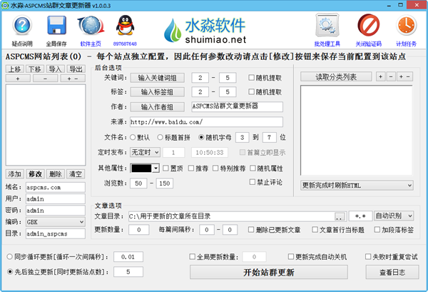 水淼ASPCMS站群文章更新器是一款专门给ASPCMS站群批量更新文章的工具,可以将一批文章自动发布到ASPCMS的文章分类下。支持多栏目随机\每篇文章单独指定分类发布。