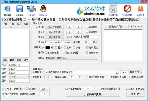 水淼SDCMS站群文章更新器是一款专门给SDCMS(门户版)站群批量更新文章的工具。可以将一批文章自动发布到SDCMS的文章分类下,支持多分类随机\每篇文章单独指定分类发布。
