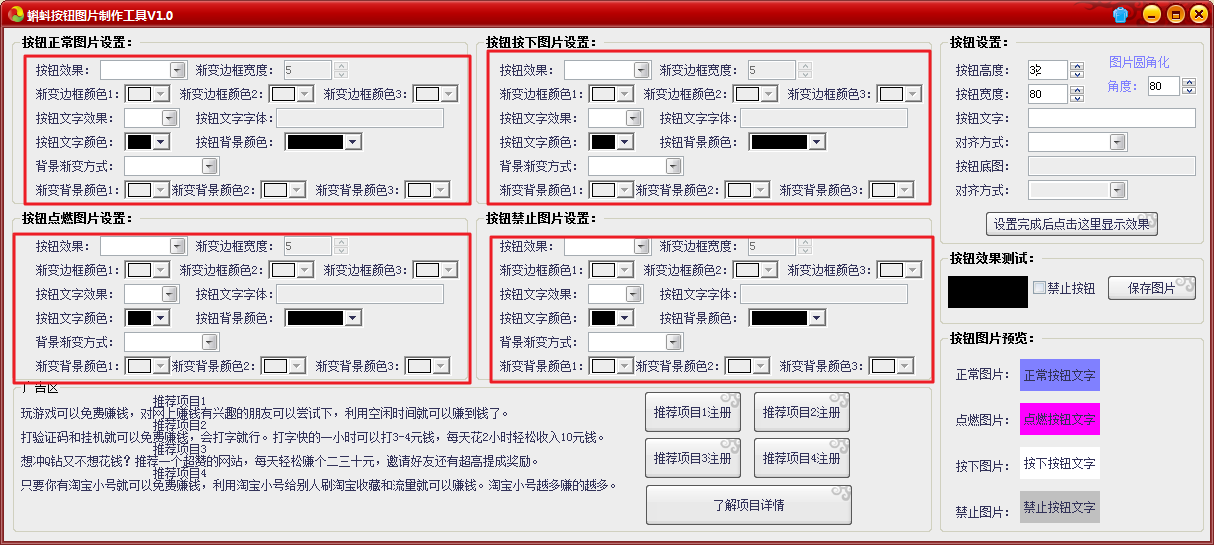 蝌蚪按钮图片制作工具是一款绿色免费的专门用于制作特效按钮图片的小工具。相对Flash等软件,该软件操作更简单,制作更方便,特效更出色。软件分步制作按钮各个状态过程,直观明了,欢迎有需要的用户下载使用!
