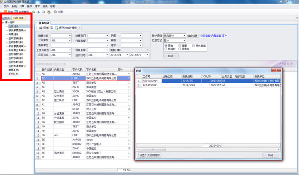 六、统计报表模块:业务量统计、开票统计、请款统计、应收应付账龄统计、未开票统计、毛利统计