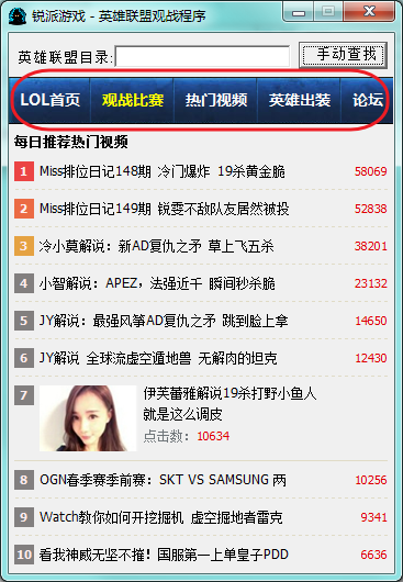 2、可快捷进入锐派LOL首页、热门视频、英雄出装、论坛。
