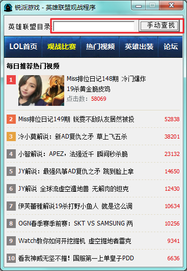 锐派英雄联盟观战程序是一款绿色小巧的LOL观战插件。使用该工具可直接在网页上进行观战,无需登陆游戏。同时还可观看最新、最热门的LOL解说视频,欢迎有需要的玩家下载使用!