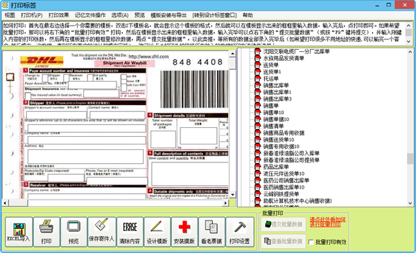 如果希望批量打印,那可以将右下角的“批量打印有效”打钩,然后在模板显示出来的框框里输入数据,输入完毕可以点右下角的“提交批量数据”(或按“F9”键将提交),并输入刚键入内容的打印张数,然后再在模板显示的框框里修改数据,再点“提交批量数据”,以此类推,等所有的数据全部录入完毕后(如希望打印很多不同地址的快递,可以输完一个客户,然后提交一次数据,直到所有客户的地址都提交完毕),就可以点“打印”按钮将所有输入的数据打印在连续快递单上。