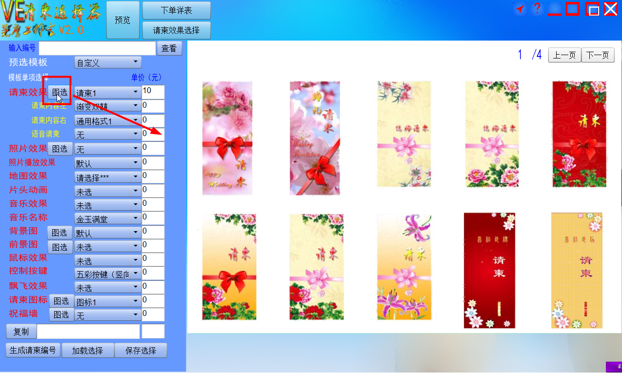 2、点“请柬效果选择”,从预选模板中选择一个基本模板,或是逐个选项单独选择,组合出你想要的请柬效果;